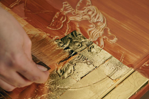 Representing a true masterpiece, the four finely moulded oak wood panels assembled using keyed joints were especially created for the occasion. The panels were degreased to ensure that the preparations could fully adhere to the base. After 25 coats of primer and careful sanding, the designs are applied, engraved and then repaired – a technique using dedicated repair tools and endowing the engraved object with strength and volume. The four panels are then prepared for gilding using the "tempera" or water gilding technique. After a drying period, some parts are burnished by rubbing them with an agate stone giving gleam and glister to the gold, while the unburnished parts were given a matt coating with diluted glue. It is then time to give life to the motifs by colouring them, in this case with oil paint. All the stages involved this magnificent work by the artisans from the Louvre can be admired on-site.