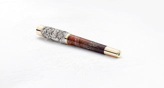 The majestic character of the Earthly Dragon (璃龙) winds around the barrel and cap of the Earthly Dragon Limited Edition 88, with green tsavorite garnets for its visible eye. While its artfully sculpted head decorates the handcrafted Ag 925 sterling silver cap as a relief, its body moulds itself to the barrel as a delicate engraving studded with diamonds, illustrating the meaning of 璃 as ‘crystal mineral’ or, originally, ‘coloured glaze’. The earthy brown-shaded colour gradient of the barrel’s lacquer surface refers to the underground habitat of the Li Long spirit. The design is further enriched with fittings made of Au 750 solid gold and a green tsavorite garnet set in the cone. The handcrafted nib, made of Au 750 solid gold, bears a delicate engraving of a book, as the eighth son of the dragon, Fu Xi, loves literature and stands as a symbol of knowledge and education. The cap top is crowned with the Montblanc emblem inlaid in black onyx and covered with sapphire glass.